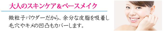 特にお化粧の中でもベースメイクは、肌の欠点をカバーし、美しく健康的に見せ、紫外線や埃などからも肌を守るものです。ベースメイクには、油性のファンデーションやパウダーファンデーションが一般的ですが、ルナレーナにはファンデーションがありません。なぜなら、肌のトラブルをなくし、いつまでもきれいな肌を保つためのスキンケアを考える時、油分を含まないパウダーの方が適しているからなのです。